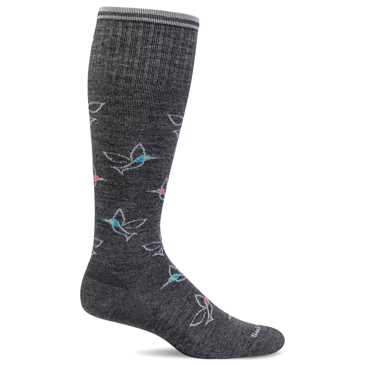 The Sockwell Freefly Charcoal 15-20mmHg moderate compression sock features spandex throughout the sock. The women’s sock includes ultra light cushion sole, graduated compression leg, turn welt top, arch support and seamless toe closure. It comprises of 33% Merino Wool, 32% Bamboo Rayon, 30% Stretch Nylon and 5% Spandex. It is machine washable with cold water and can be air dried.