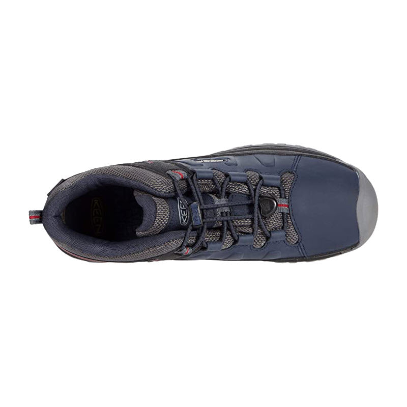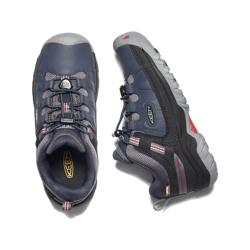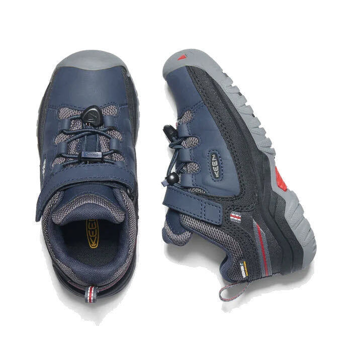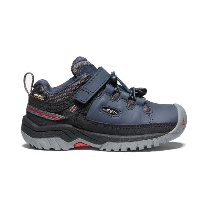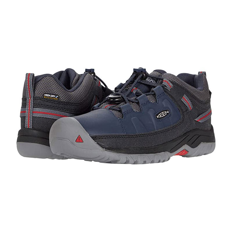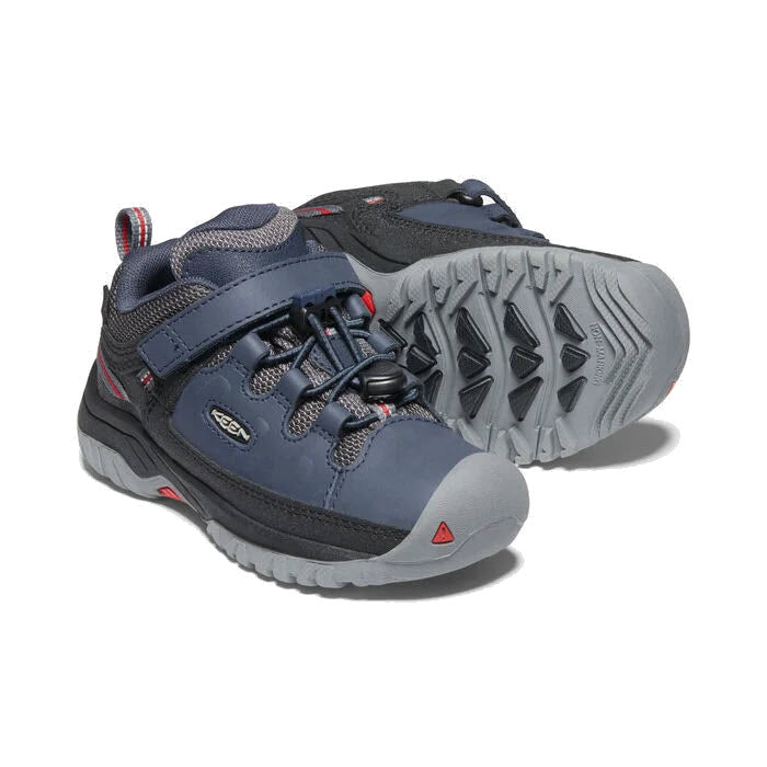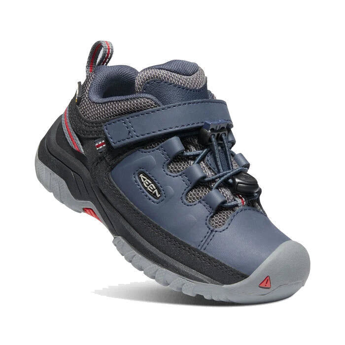 The Keen Targhee Low WP Blue Nights/Red Carpet kid’s shoe features the leanness, toughness, and gritty design like its adult hiking shoes. The hiking shoe is made of waterproof leather and a textile upper with breathable mesh lining. It comprises a non-marking rubber outsole, removable EVA insoles, a TPU heel-capture system, a padded tongue, and a collar for comfort and stability. It includes PFC-free durable water repellent and Cleansport NXT™ for natural odor control.