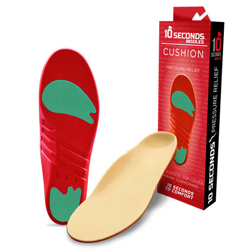 The Ten Seconds Pressure Relief insole is a lightly supportive replacement insert that will add cushion and comfort to your shoe. The soft Plastazote® top layer uses your body’s heat to mold to the base of the foot and the deep heel cushion provides added comfort in the shoe. Recommended for diabetics and arthritis sufferers. This insole will fit in most athletic, casual, and hiking shoes that come with removable footbeds. The insole has Abzorb® foot strike pads that are strategically placed for maximum shock absorption at the heel and forefoot. In addition, the extra deep heel cup cushions the foot naturally utilizing the cushioning tissues in the heel of the foot. PVC and latex-free. Note that these are listed in men's sizes but use the chart below for conversions.
