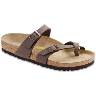 Both stylish and supportive, the Mayari Birkibuc sandal from Birkenstock has a soft Birkibuc upper and features a toe loop and two adjustable straps with buckle closures for a snug, custom fit. The signature Birkenstock suede-covered molded cork footbed offers shock absorption to avoid fatigue and arch support for stability.