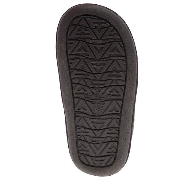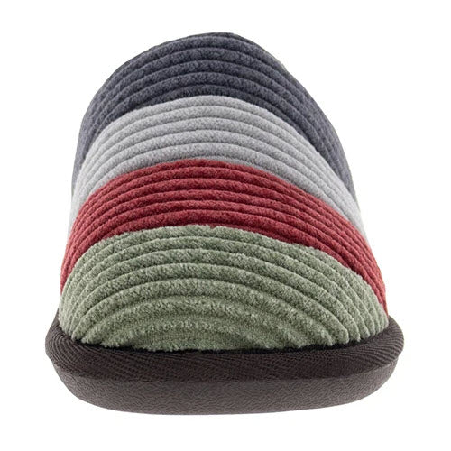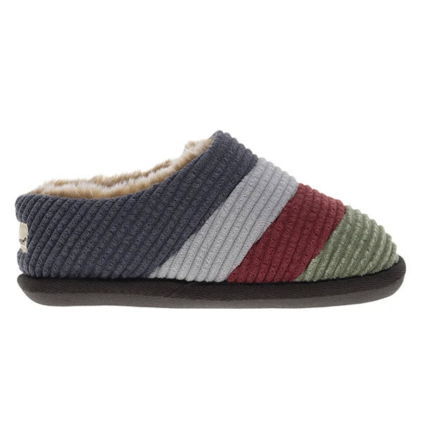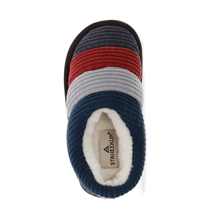 The Staheekum Clemson is an easy to slip-on scuff slipper. It has a color blocked corduroy exterior in blue, red, and gray with a recycled water bottle lining. Inside is a built-in memory foam insole for added comfort.
