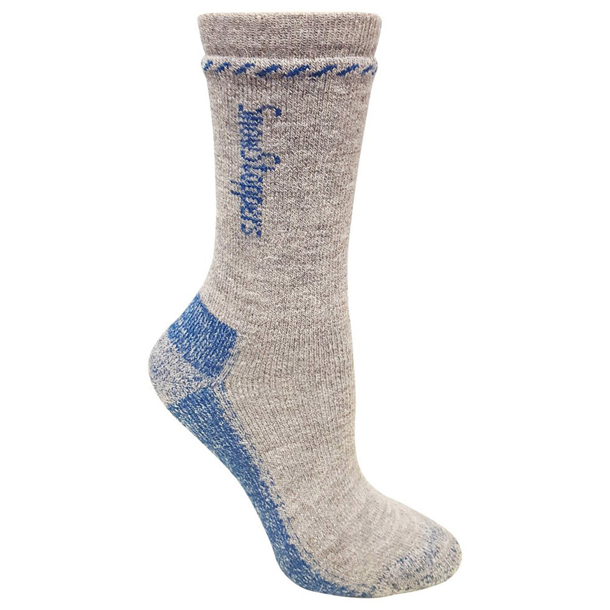 The Snowstoppers kids Alpaca sock in grey/blue offers warmth and an ultra-soft feel. This sock is made of Peruvian alpaca Wool and is water-resistant, antimicrobial, and nonallergenic. It comprises 45% alpaca, 42% acrylic, and 13% nylon. Wash the sock in cold water and air dry.