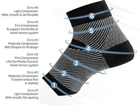 The Os1St Performance Foot Sleeve helps relieves symptoms of plantar fasciitis, Achilles tendonitis, heel pain, foot swelling, and other discomforts. This sports foot compression sleeve will support the muscles while you work hard and are comfortable and easy to wear daily. The high-performance design delivers six different zones of compression. The support sleeve can be worn under socks and inside shoes or overnight for relief from morning pain. Worn as a pair, during your run or sport, FS6® functions as strengthening support and Plantar Fasciitis preventative. One pair per pack. Medium fits men's shoe size 6 to 9½ or women's size 7 to 10½. Size large fits men's 10 to 13. Refer to the size chart before ordering.