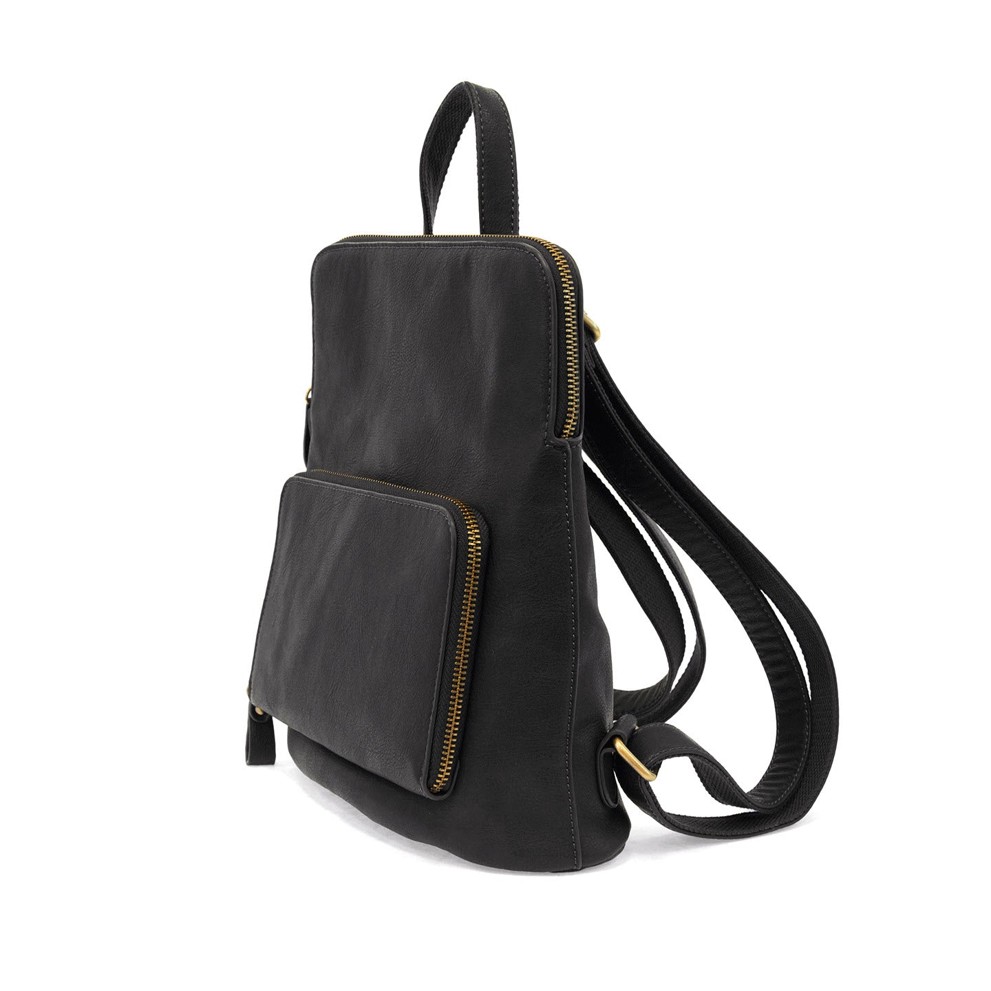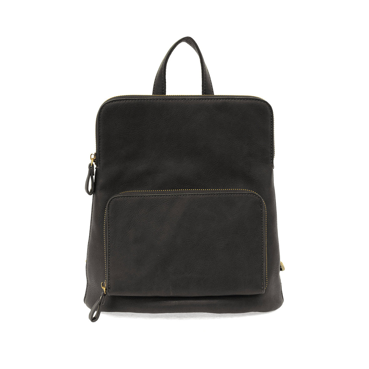 The Joy Susan Julia Mini backpack features a sleek silhouette that makes this faux leather backpack both practical and comfortable enough for everyday use. It is about 11” x 11” by 4” deep and has a zip-top closure. It has three card slots in the zip front pocket and two additional open inner pockets. This bag features brass plated hardware.