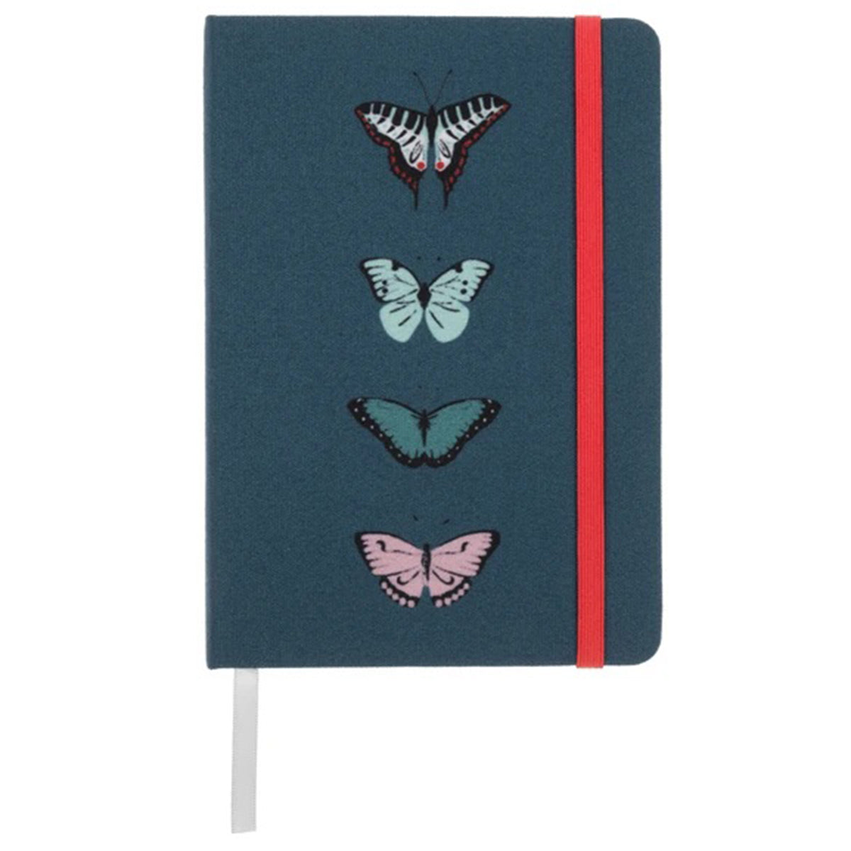 The Sophie Allport Fabric Notebook Butterflies is a perfect handy notebook that features four beautiful butterflies on a dusty blue background. The B6 Sized notebook includes 160 pages of ruled paper, a ribbon page marker and elastic closure. It measures 17.5cm x 12.5cm x 1.5cm.