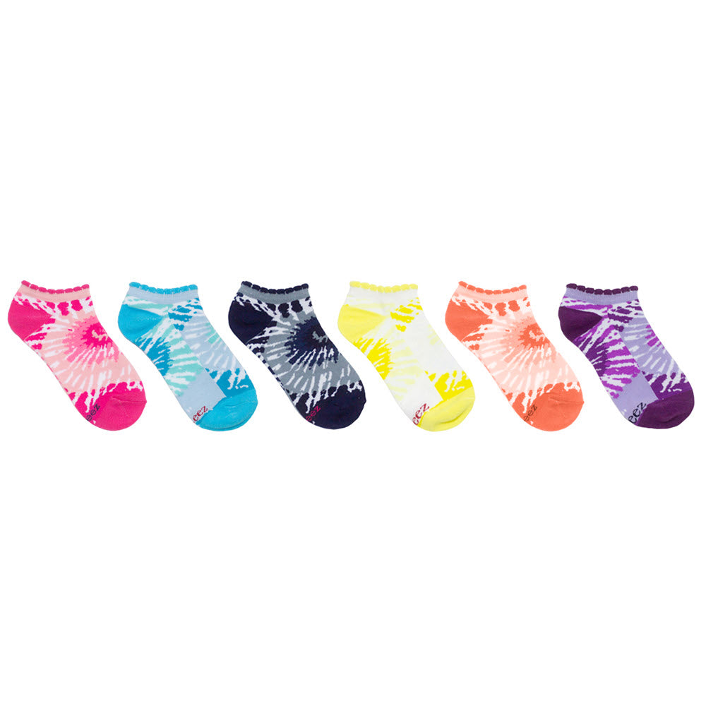 Robeez 6-pack multi color tie dye pattern no shows. These socks have knitted logo on the bottom and comfort toe seam.