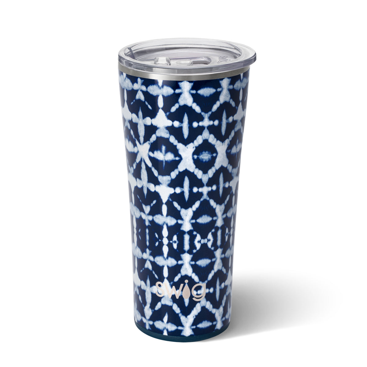 The Swig 22 Oz Tumbler Indigo Isles features a slim shape and is cup holder friendly. The triple insulation technology keeps drinks cold for up to 24 hours and hot for up to 12 hours. It is slip-free, scratch-free, condensation-free, dishwasher safe, and includes a noise-free silicone base. The non-breakable tumbler fits most standard cup holders and includes a BPA-free lid with a removable slider. It is constructed of 5mm 304-18/8 stainless steel and measures 7.75" H x 3.5" W (lid included); the base is 2.75" in diameter.