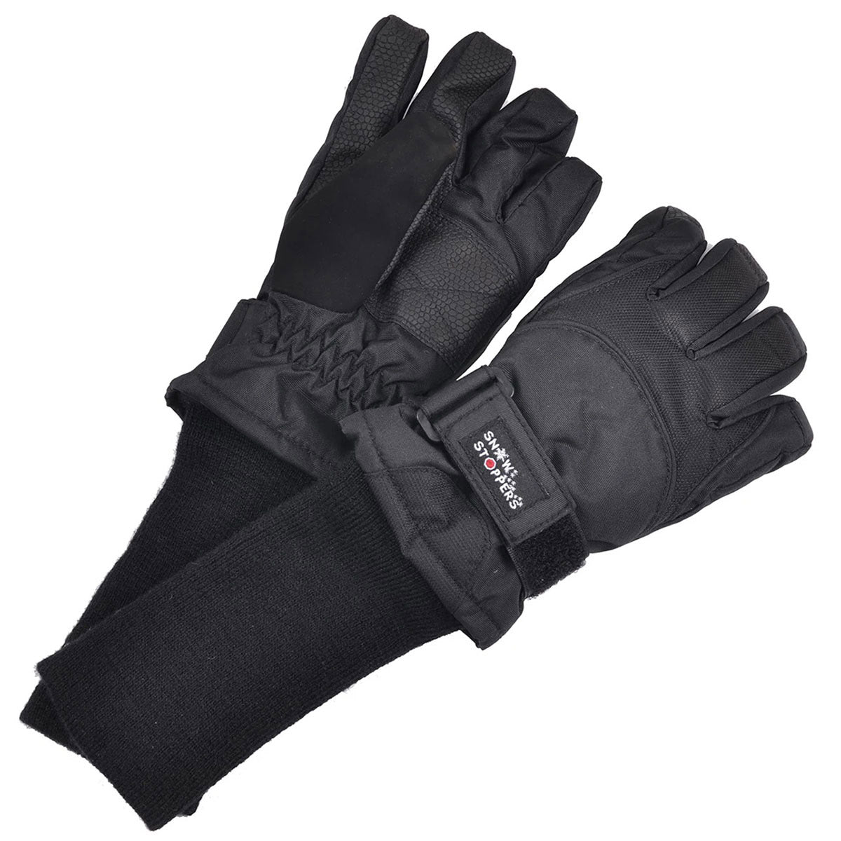 The SnowStoppers Ski & Snowboard Glove in black features the patented SnowStoppers® extended cuff. This rugged glove features shorter glove fingers to keep hands warmer like a mitten. The Kevtech Palm provides abrasion resistance and excellent grip. It is made of water resistant Ripstop Nylon outer shell and Thinsulate™ 40 Gram Insulation for warmth.