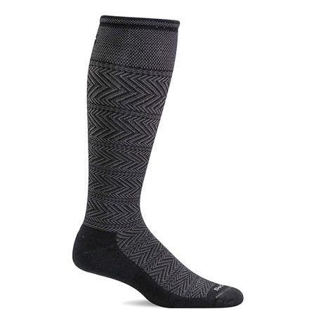 The Sockwell Chevron Twill Men's 20-30mmHg sock features Accu-fit Technology, turn welt top, arch support, graduated compression and seamless toe closure. It also features an ultra-light cushion sole. It comprises of 31% Merino Wool, 31% Rayon from Bamboo, 31% Stretch Nylon and 7% Spandex. The size Med/Large fits about a size 7 to 10 and the size large/XL fit about a shoe sizer 10½ to 13.