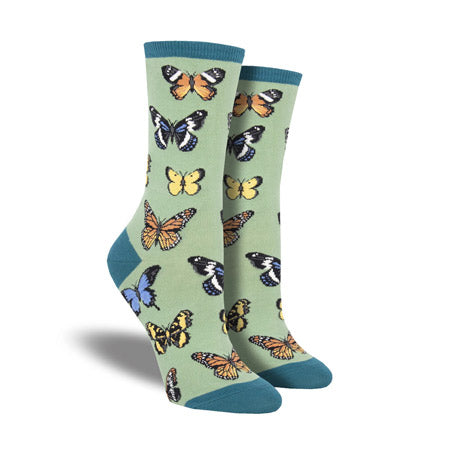 The Socksmith Majestic Butterflies women's sock features the pattern of different colored butterflies. It is made of 63% Cotton, 34% Nylon, and 3% Spandex.